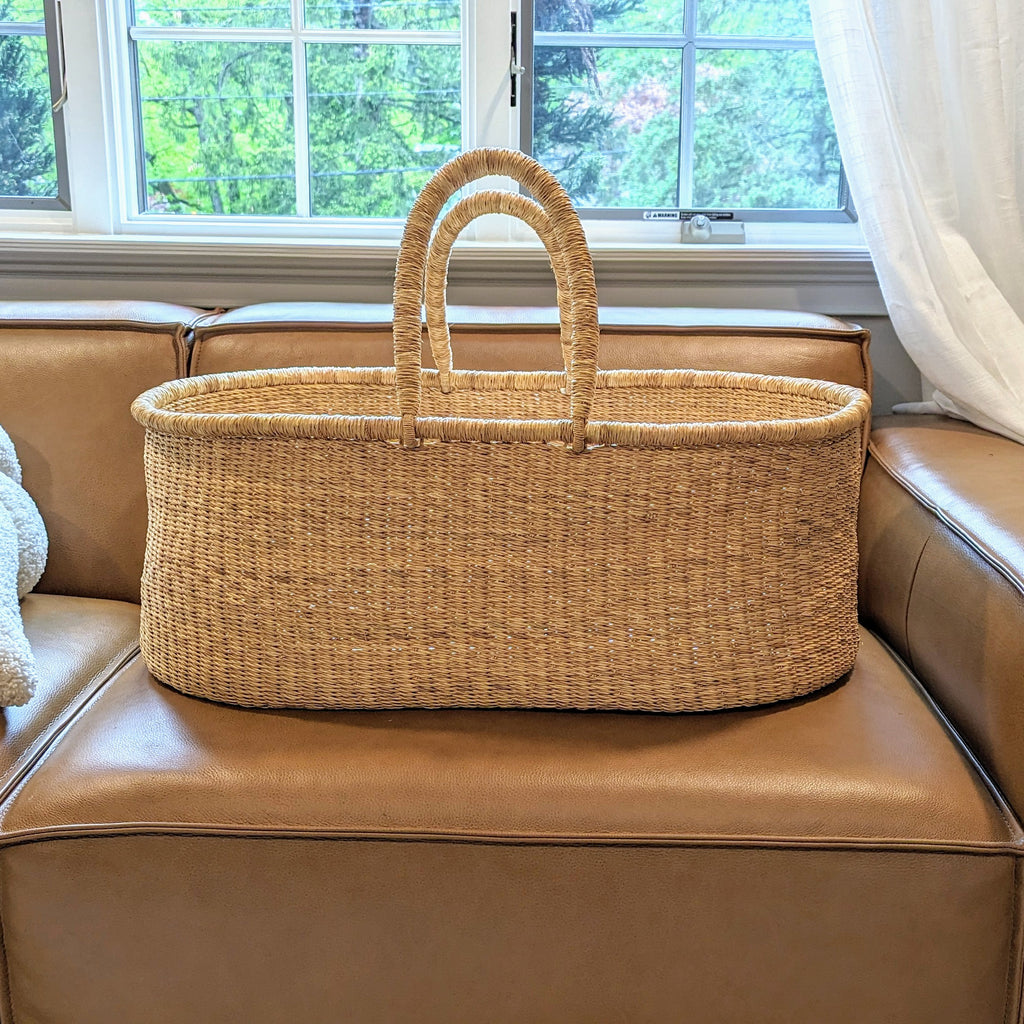 We call our bassinets, "Nature's Bassinets", as they are completely handmade with dried natural elephant grass. Elephant grass is similar to hardened hay. Each basket takes several days to weave from start to finish. This is a very difficult completely handwoven craft, as a result patterns and natural dyeing may vary slightly. Leather handle colors may range slightly within their color groups.