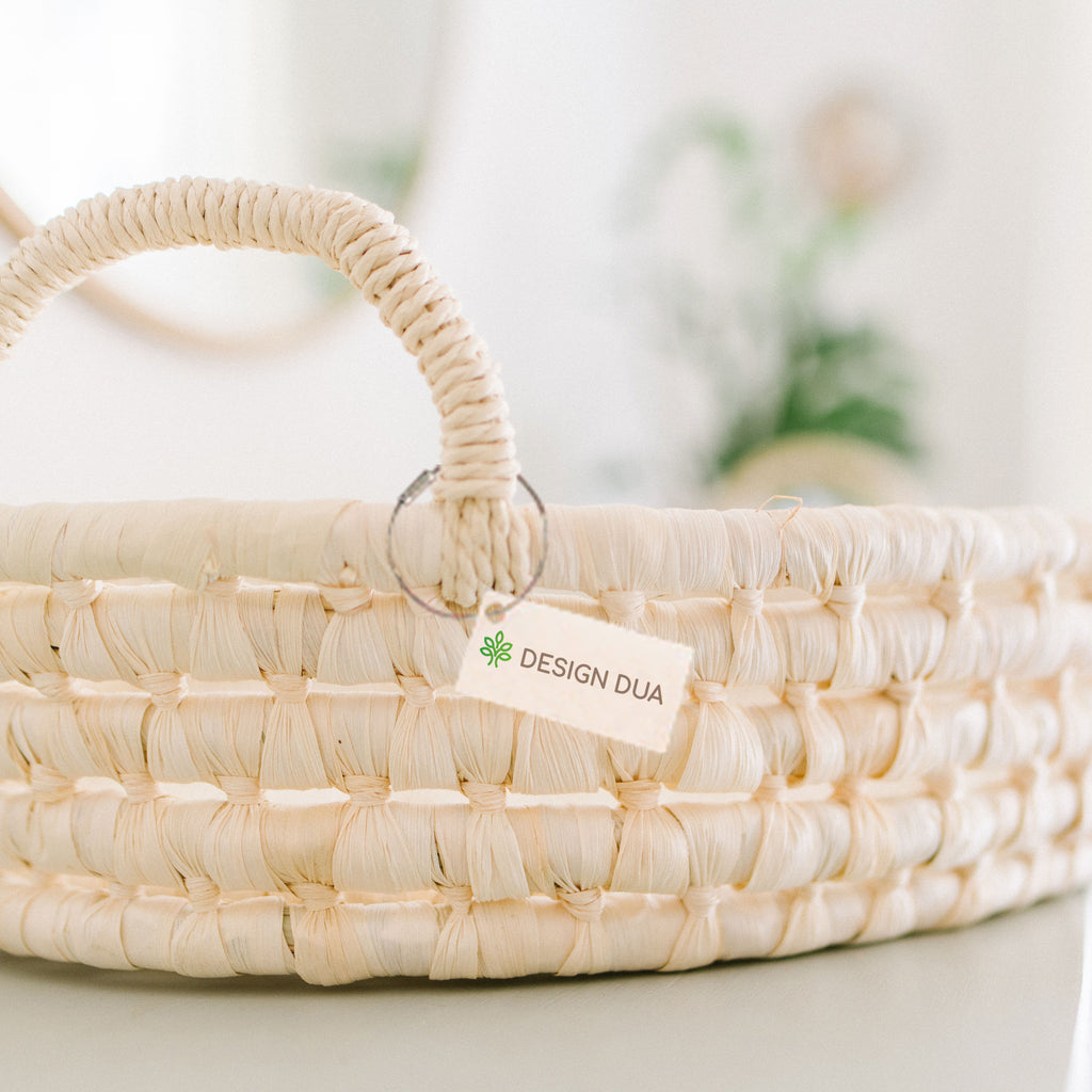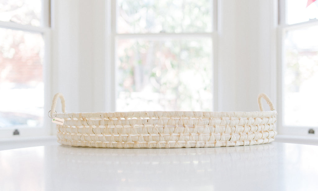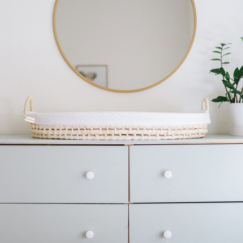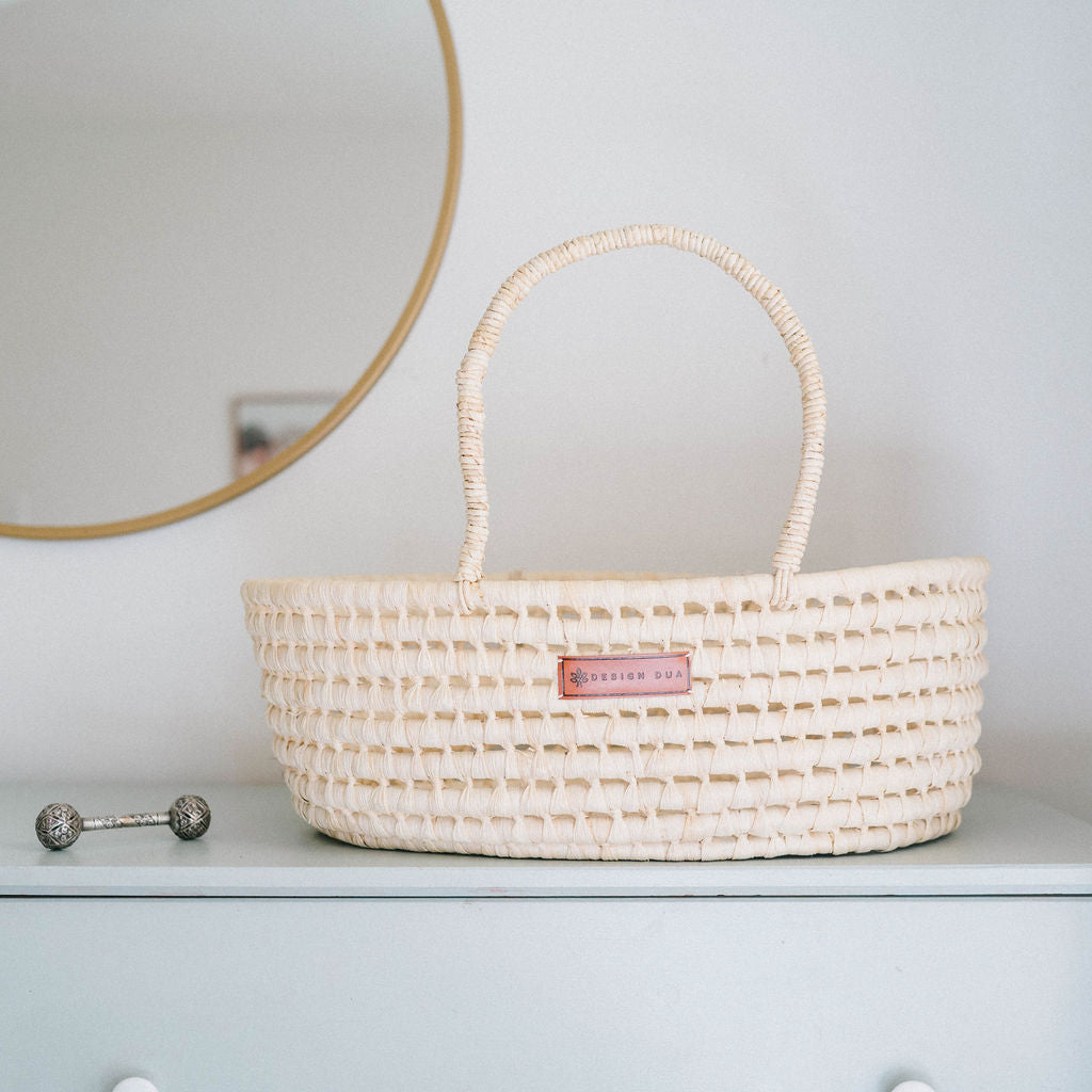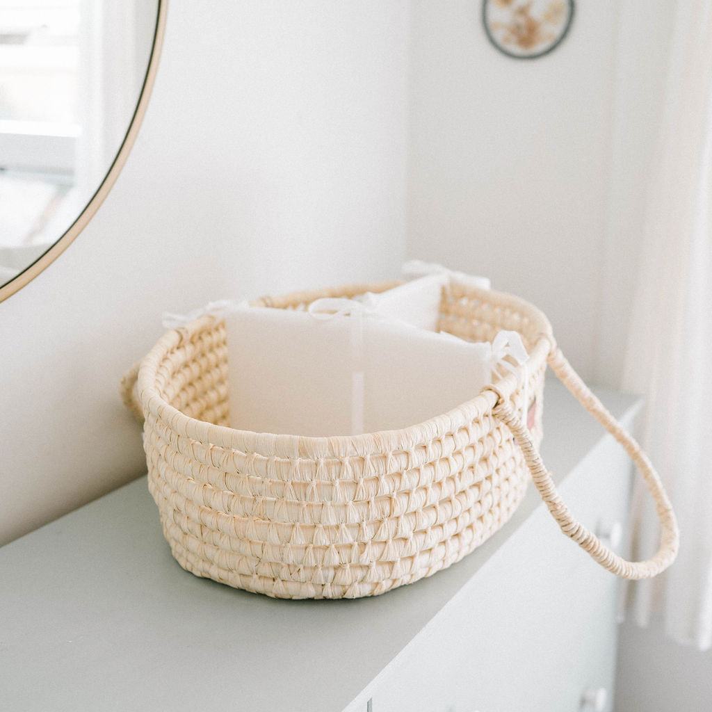 The Afia Changing Basket is a beautiful decorative nursery basket handcrafted from maize. This basket is handwoven to perfection as the perfect addition to your baby's room. Instead of the normal drab changing pad, this basket will bring beauty to your dresser. This is an absolutely lovely baby shower gift!