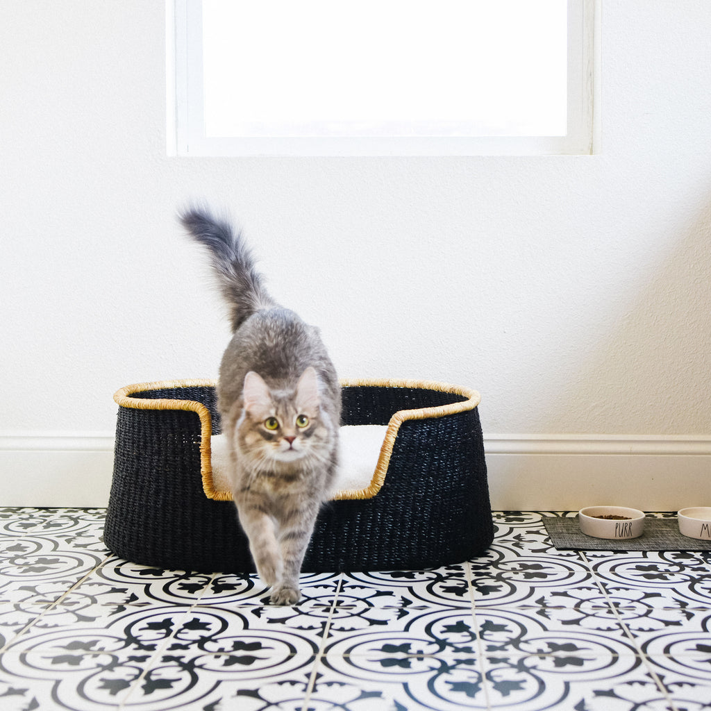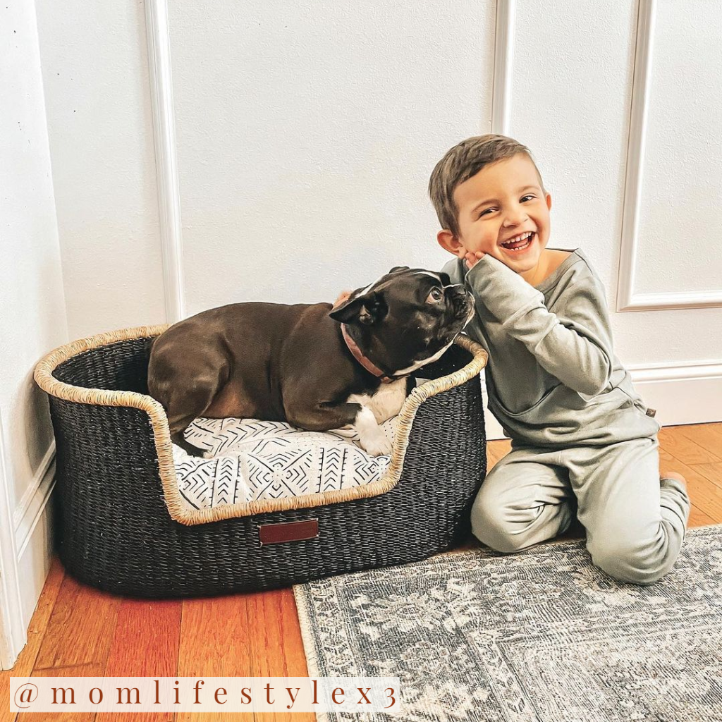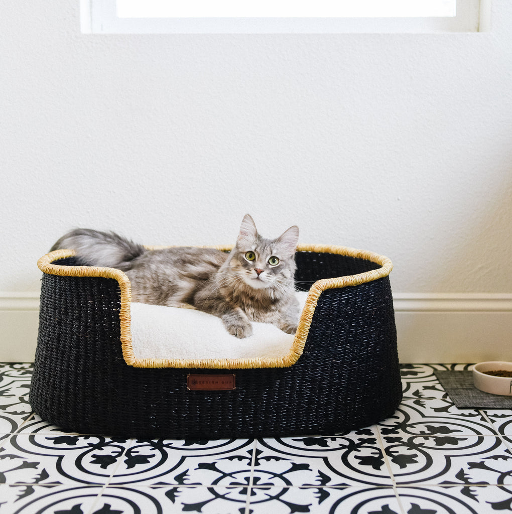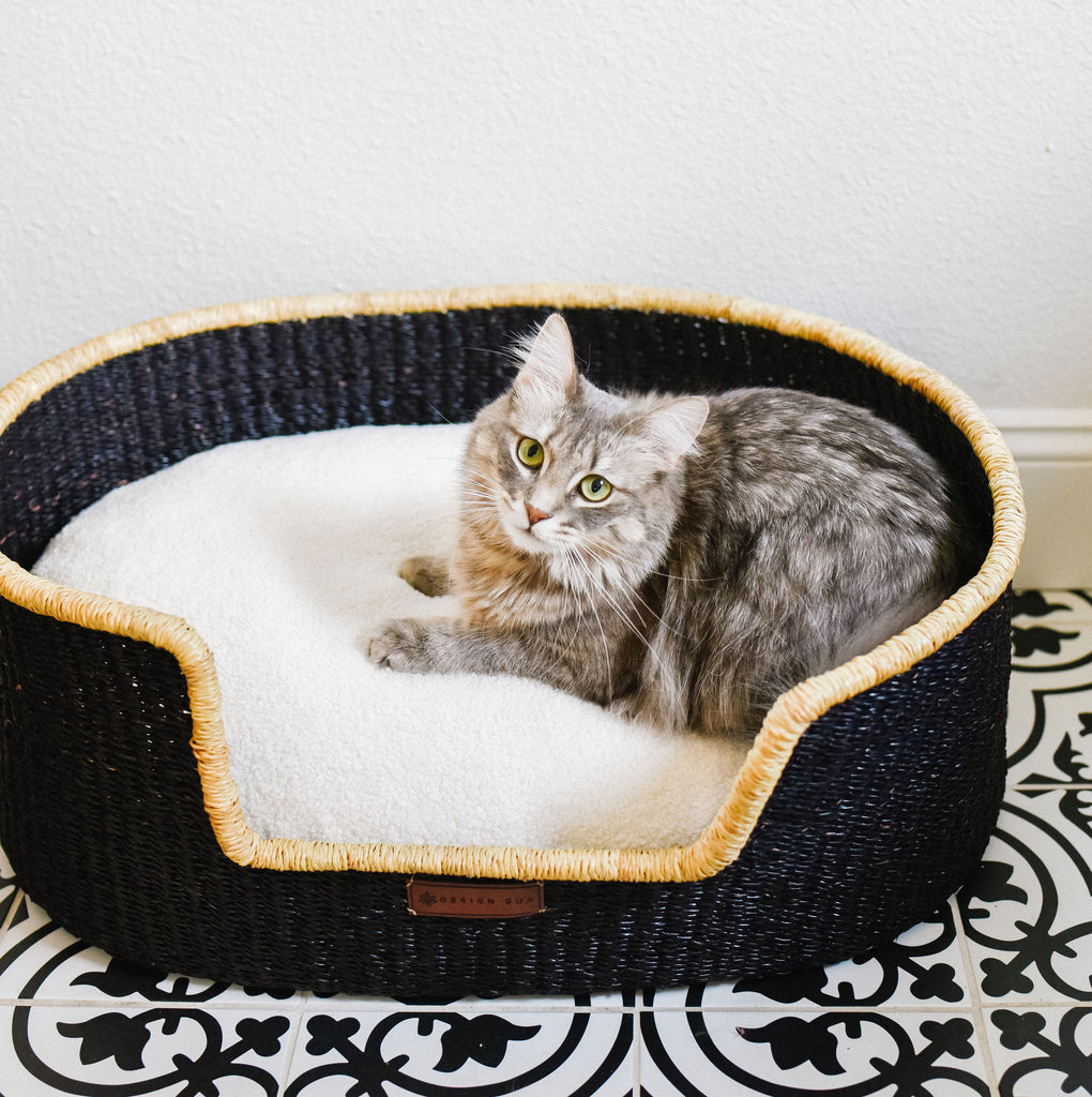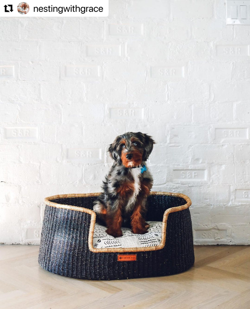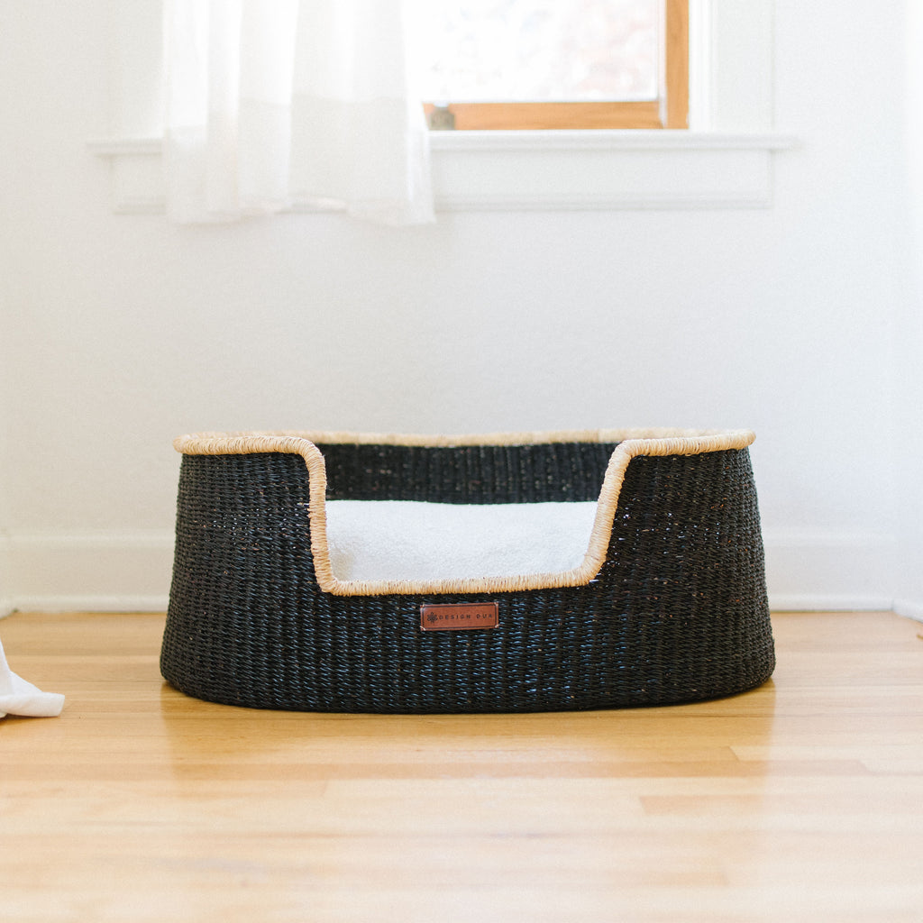 Design Dua won the HGTV Best New Product award for our unique use of traditional Ghanaian craft techniques and innovative design to invent this new product. Made from Natural Elephant Grass and Dyes this Pet Bed is made in honor and memory of our beloved dog named Bear. It is beautifully handcrafted for your dog. Each basket takes several days to weave from start to finish. The basket comes with a fitted cushion. No fur babies are harmed in the process of making this product.
