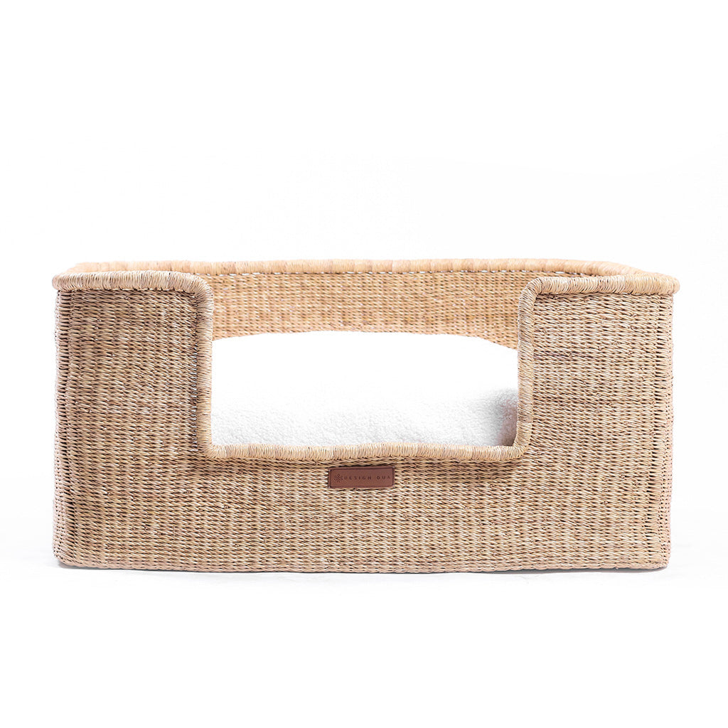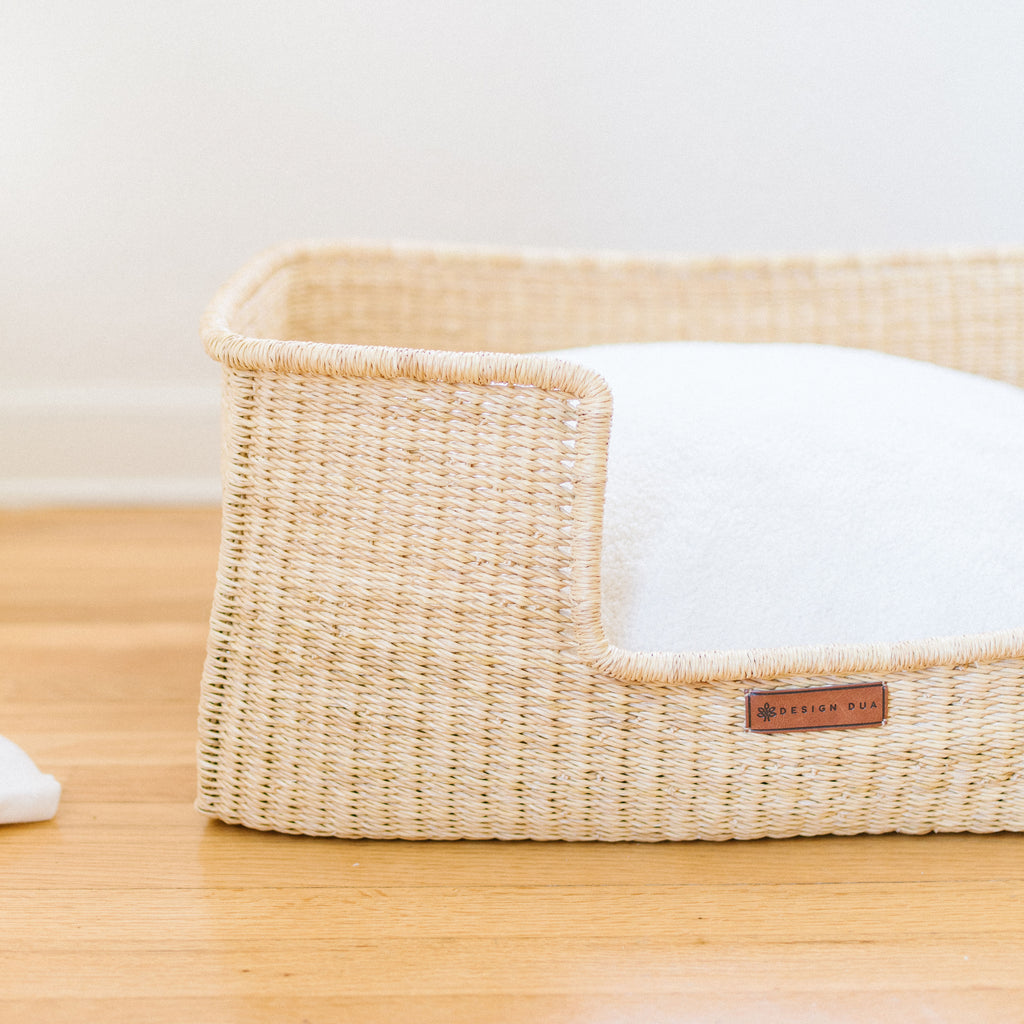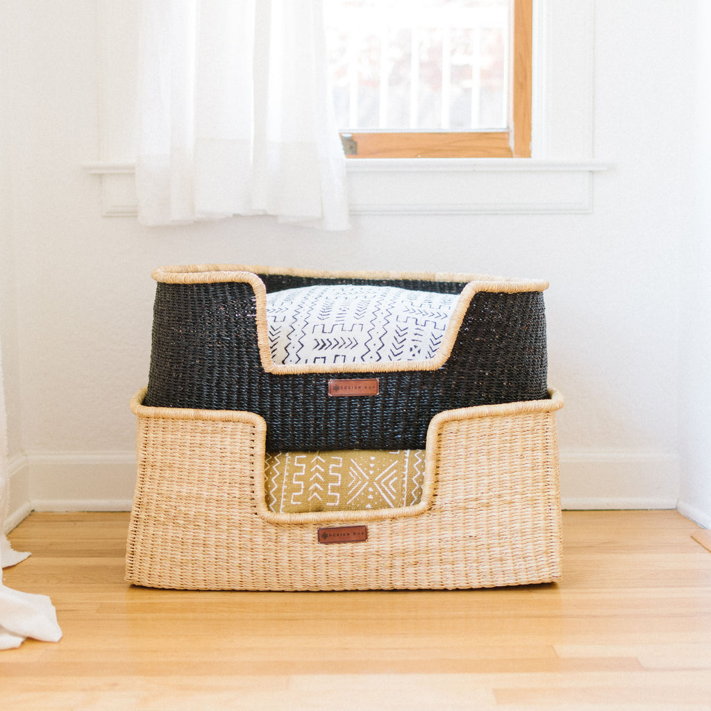 Design Dua won the HGTV Best New Product award for our unique use of traditional Ghanaian craft techniques and innovative design to invent this new product. Made from Natural Elephant Grass and Dyes this Pet Bed is made in honor and memory of our beloved dog named Bear. It is beautifully handcrafted for your dog. Each basket takes several days to weave from start to finish. The basket comes with a fitted cushion. No fur babies are harmed in the process of making this product.