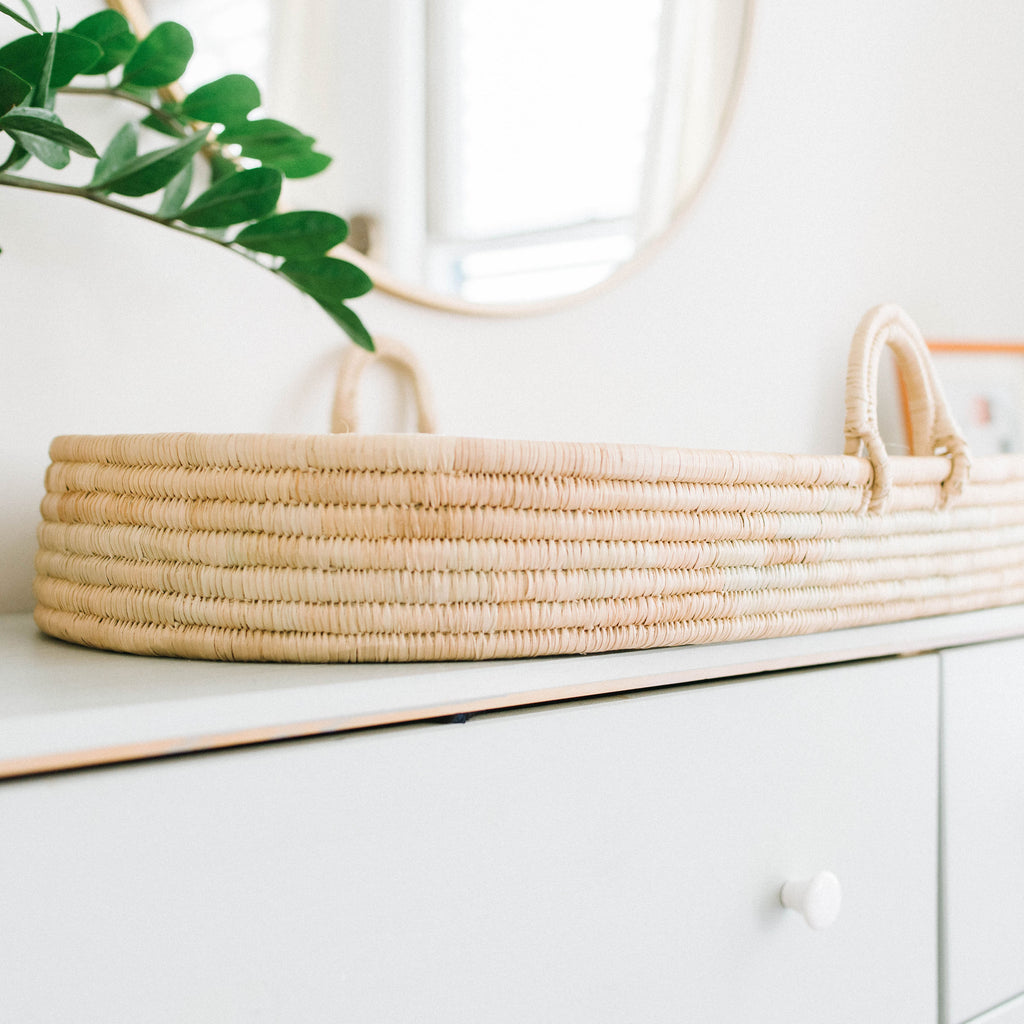 The Malaika Changing Basket is a beautiful decorative nursery basket handcrafted from sisal grass and straw. This basket is handwoven to perfection as the perfect addition to your baby's room. Instead of the normal drab changing pad, this basket will bring beauty to your dresser. This is an absolutely lovely baby shower gift!